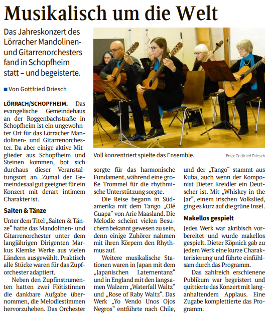 Im Blickpunkt: Das Jahreshauptkonzert in der Aula des Hans-Thoma-Gymnasiums unter dem Motto „Vamos A Bailar“, bei dem Dieter Köpnick souverän und mit Bravour durch das anspruchsvolle Programm führte, war noch einmal Thema. Viel Applaus gab es dabei für Dirigent Markus Klemke, der das Orchester mit viel Selbstvertrauen dirigierte. Ein besonderes Ereignis dabei war die Ehrung von Edith und Karl-Heinz Klemke, die für 50-jährige Treue zum Mandolinen- und Gitarrenorchester Lörrach mit dem Ehrenbrief des Bundes deutscher Zupfmusiker ausgezeichnet wurden.